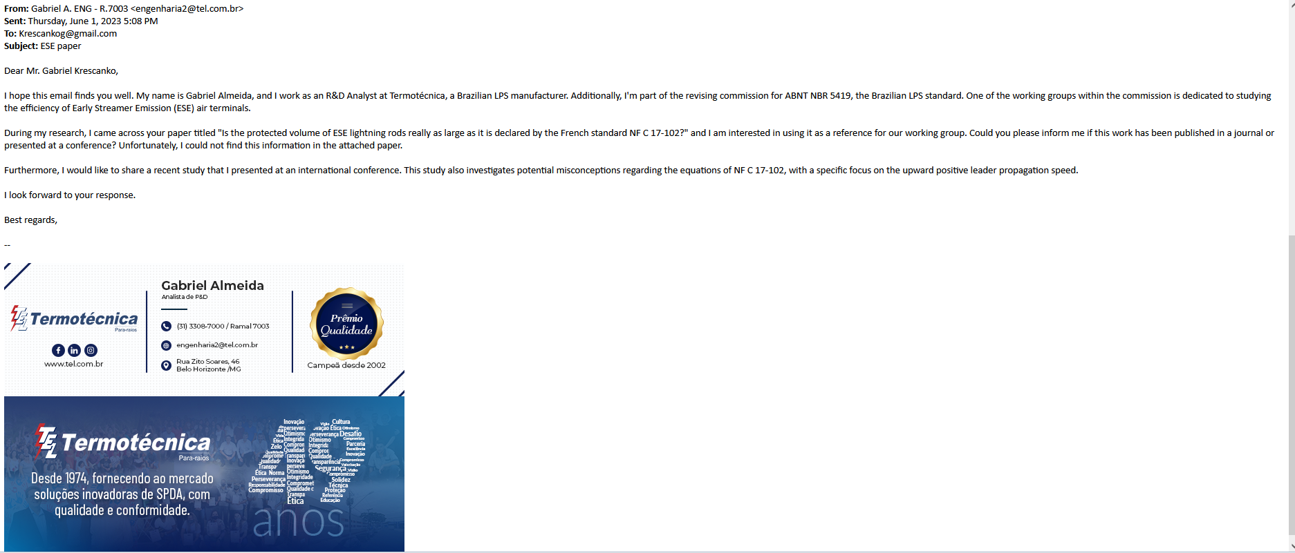 dúfam, že sa Vám tento e-mail bude páčiť. Volám sa Gabriel Almeida a pracujem ako analytik výskumu a vývoja v spoločnosti Termotécnica, brazílskeho výrobcu ochrany pred bleskom (LPS). Okrem toho som členom komisie pre revíziu brazílskej národnej normy ABNT NBR 5419 na ochranu pred bleskom. Jedna z pracovných skupín v rámci tejto komisie sa venuje štúdiu účinnosti aktívnych bleskozvodov – Early Streamer Emission (ESE).